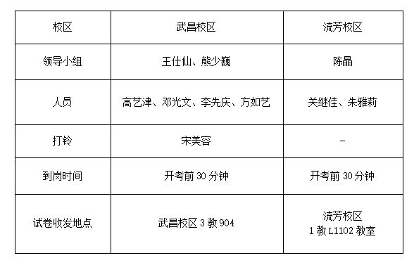 各二级学院、相关部门:根据《武汉工程大学邮电与信息工程学院2025-2026学年第一学期第11周提前批考试安排》相关安排,本次考试将于2025年11月22日举行。为贯彻执行学院有关文件精神,确保本次考试工作顺利实施,现就有关事宜安排通知如下: 一、考试时间 2025年11月22日 二、考场地点 武昌校区三号教学楼、流芳校区一号教学楼 三、工作分工 1.考务组 ![]() 职责:考务组对考试工作全面负责,统筹协调并解决考试工作中的相关问题。考务组人员主要负责本次考试的各项考务准备工作,值班当晚考场检查,试卷分发、回收、巡视单的收集并做好通报,处理其他突发事件等。 2.巡视组 武昌校区: 孙 琳、龙美莉 流芳校区: 关继佳、朱雅莉 职责:主要负责巡视所在楼层的考场秩序,检查监考人员履行职责的情况,发现问题要及时向监考教师和考务人员提出改进意见。巡视情况单须当晚交到教务部高艺津老师汇总。 3.考风考纪组 地点:武昌校区3号教学楼九楼会议室 流芳校区1号教学楼L1102教室 职责:对学生的违规作弊行为进行认定,处理学生违纪舞弊事件。 四、工作要求 1.高度重视。各工作人员要高度重视本次考试工作,认真做好考试各环节的工作,切实保障考试工作的顺利进行。 2.认真履职。各工作人员及监考人员应按照考试工作总体安排,按时到岗,认真履职,遇到问题及时反馈沟通,确保考试工作规范有序。