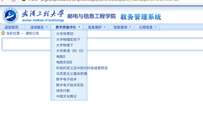 各位同学: 2025~2026学年度第一学期学生网上评教工作即将开始,我院学生网上评教系统已启动,请同学们在规定时间对任课教师及所代课程进行评教 (注:如不参加评教将影响后期的成绩查询和登录)。现将有关事项通知如下: 一、评教时间:2025年12月23日12:00——2025年12月29日14:00 二、评教步骤: 1、登录http://jwgl.witpt.edu.cn/(备用链接:http://jwgl2.witpt.edu.cn/,需内网vpn访问),进入武汉工程大学邮电与信息工程学院教务管理系统。 2、点击“学生评教”,进入教务管理系统,输入用户名和密码以学生身份进行登录。2025级新生用户名和密码为本人学号,初次登录需重新设定密码。密码的查询及重置请联系所在二级学院的教学秘书。 ![]() 3、点击“教学质量评价”下拉菜单,任选一门课程。 ![]() 4、选定参评课程及相应的评价等级(A、B、C、D),评价结束点击“保存”。 ![]() 5、当所有课程评价结束以后点击“提交”完成本学期教学质量评价。 学生对任课教师的授课和课程进行客观、公正的评价,将有关信息反馈到学院有关部门和二级学院,是提高教学质量的基础工作。 因此,教学质量评价对提高学校教学质量和维护您自身的权益都将起到重要的作用。请同学们认真对待,及时评教。 特此通知。